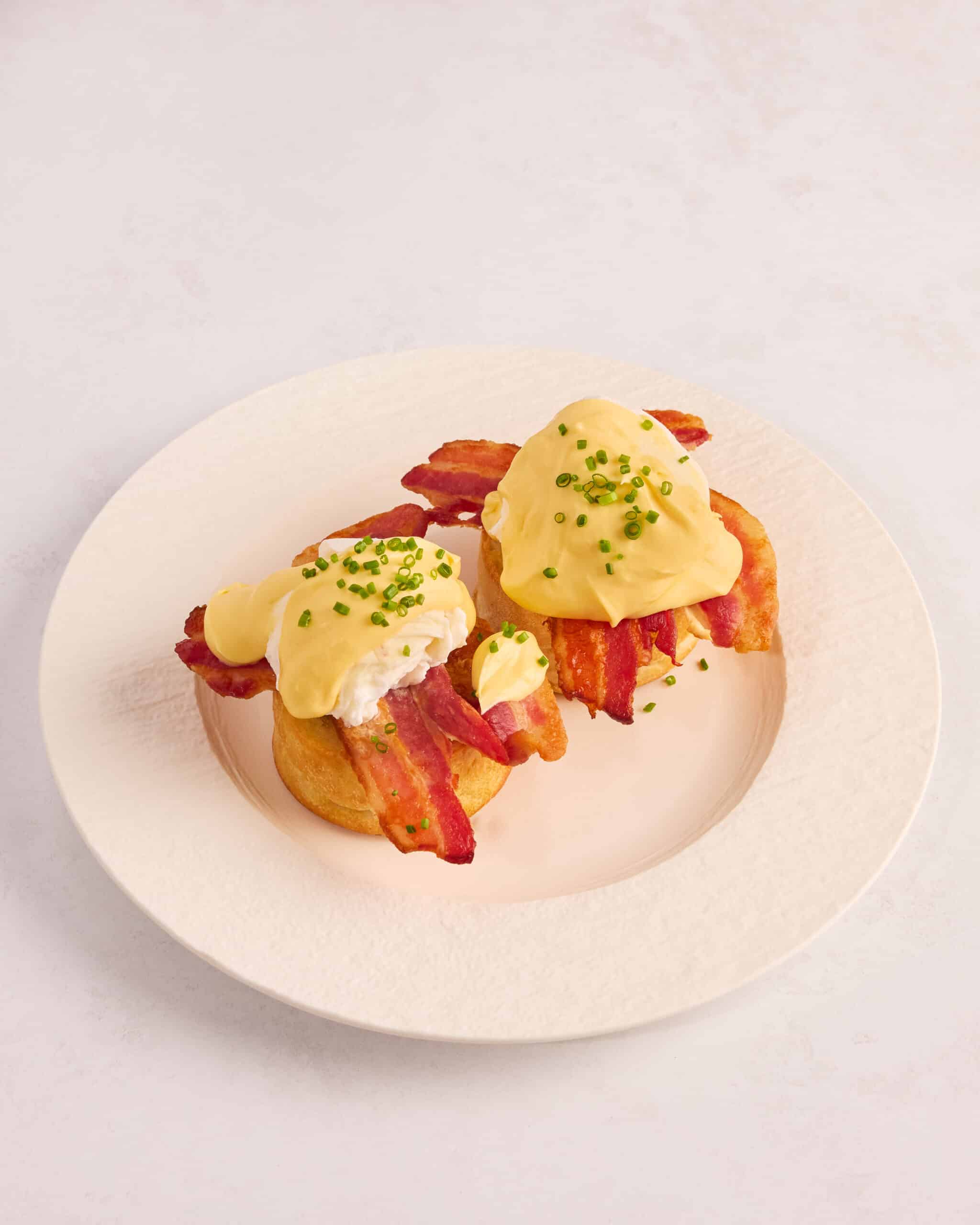 Waterford farm smoked streaky bacon, poached Clarence Court eggs, and Mornay sauce. Served on toasted sourdough English muffin.