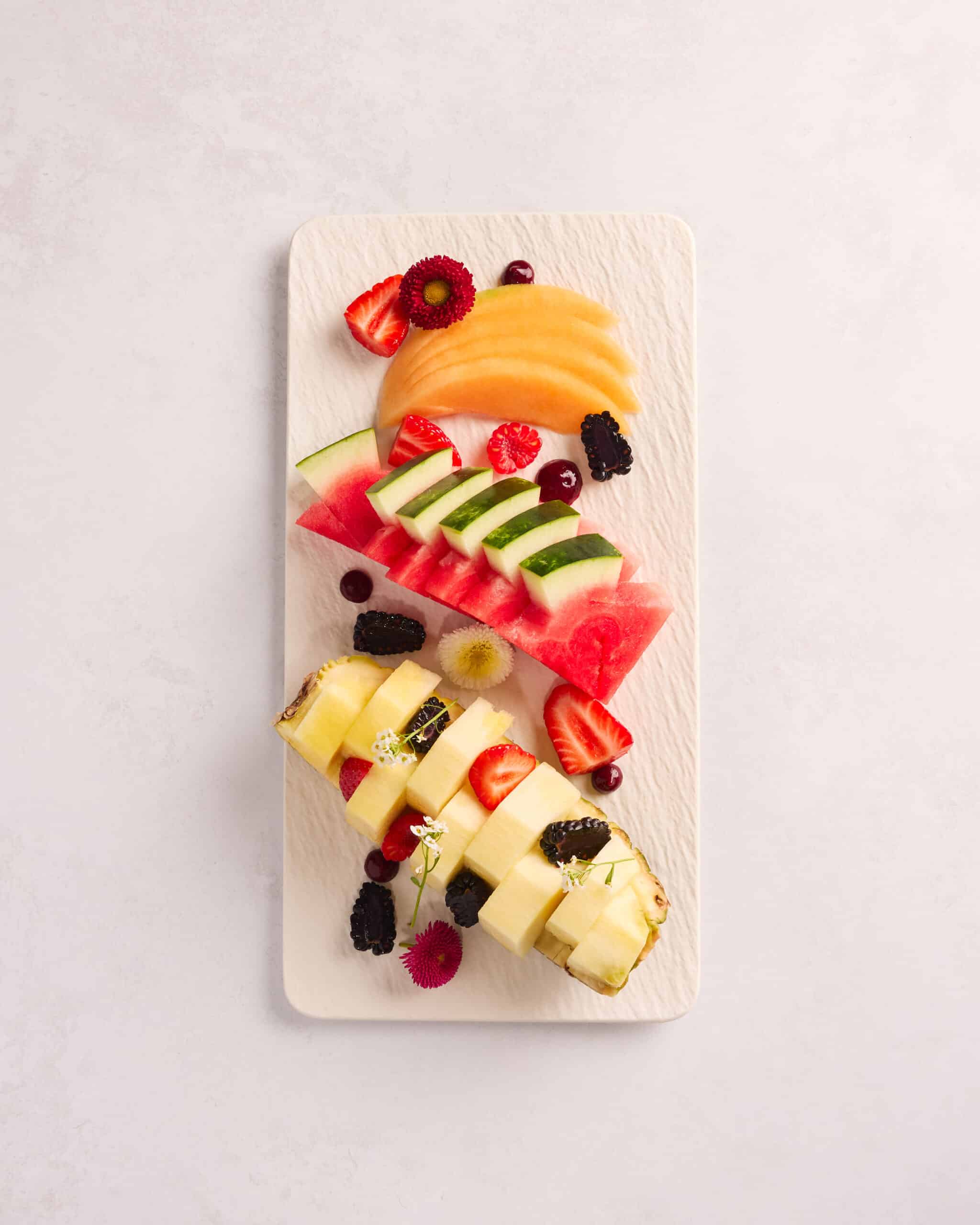 Seasonal sliced fruit selection.